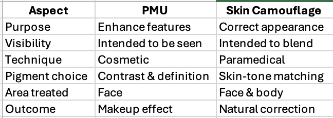 Although PMU and skin camouflage both involve pigment and tattooing, they serve entirely different purposes.